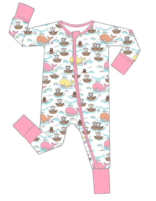 This "Faith Knows no Boundaries" Convertible Jumpsuit, inspired by the story of Jonah and the whale, offers soft, breathable comfort with 95% bamboo and 5% spandex fabric. Its stretchy material features a two-way zipper and fold-over hands and feet for versatile wear. Available in two color schemes, this jumpsuit beautifully symbolizes how faith and love transcend all limits.